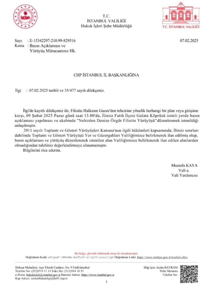 İstanbul Valiliği ise 2911 sayılı Toplantı ve Gösteri Yürüyüşleri Kanunu’nun hükümleri kapsamında Galata Köprüsü’nde basın açıklaması ve yürüyüş yapılmasına izin çıkarmadı. Yapılan açıklamada, “tarafımızca belirlenen toplantı ve gösteri yürüyüşü yer ve güzergâhları” arasında Galata Köprüsü’nün olmadığı belirtilerek CHP’nin talebi reddedildi.