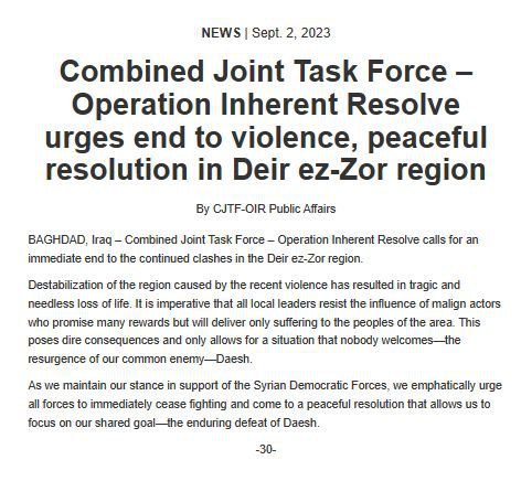 ABD liderliğindeki uluslararası koalisyon tarafından IŞİD’e karşı kurulan Birleşik Müşterek Görev Gücü – Doğal Kararlılık Operasyonu ( CJTF-OIR ) askeri oluşumu Suriye’deki çatışmalar hakkında açıklama yaptı.