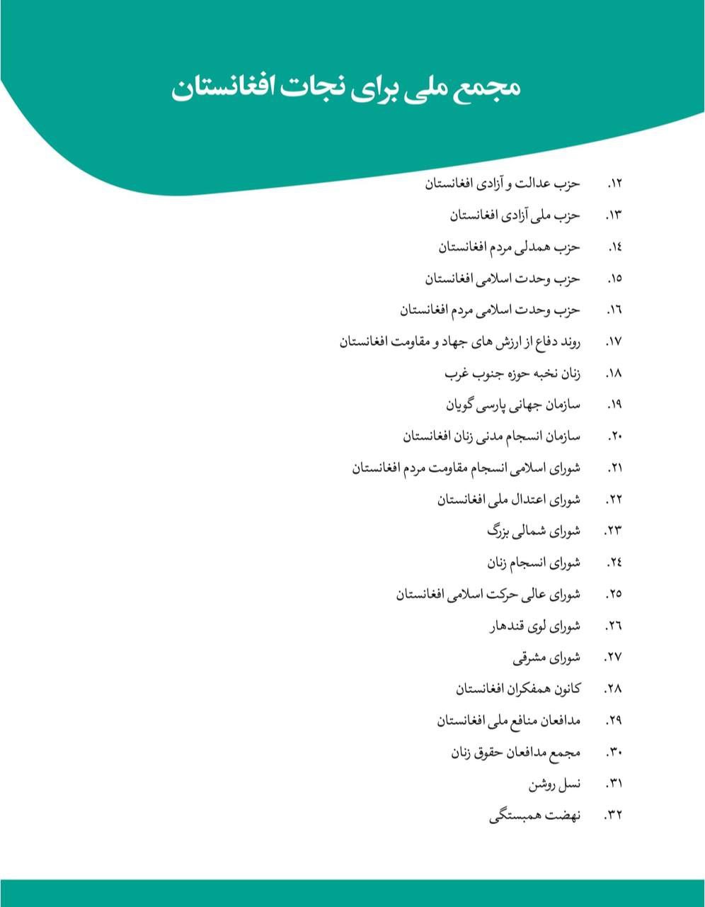 Buna göre, Taliban karşıtı örgütte Atta Mohammad Noor liderliğindeki Afganistan İslami Cemaat Partisi, Muhammed Karim Halili liderliğindeki Afganistan İslami Birlik Partisi ve liderliğindeki Afganistan Ulusal İslami Hareket Partisi’nin de aralarında bulunduğu 32 siyasi parti, kurum ve konsey bulunuyor.