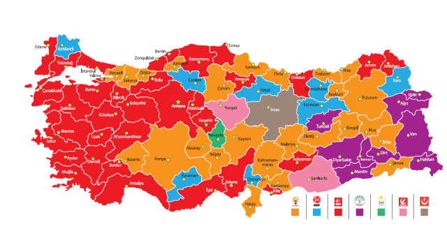 İstanbul, Ankara ve İzmir’i koruyan CHP, Türkiye genelinde de oylarını artırarak Ak Parti’nin elindeki pek çok ili aldı. AK Parti’nin elindeki çok sayıda il muhalefete geçti. Ak parti, Adıyaman, Afyonkarahisar, Ağrı, Balıkesir, Bursa, Denizli, Giresun, Gümüşhane, Nevşehir, Muş, Sivas, Tokat, Şanlıurfa, Yozgat, Zonguldak, Kırıkkale ve Kilis’i kaybetti.