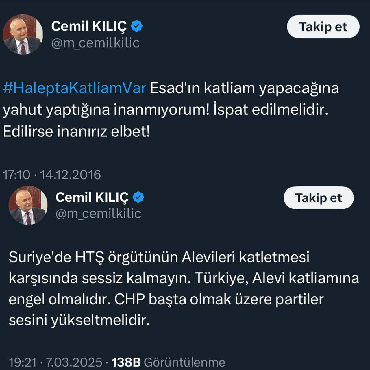 2016 yılında yaptığı bir paylaşımda kendi halkının katili olan Beşşar Esad’ın Halep’te katliam yaptığına inanmadığını ve yüzlerce görüntüye rağmen iddiaların ispat edilmesi gerektiğini öne süren Kılıç, bugün yaptığı “Suriye’de HTŞ örgütünün Alevilere yönelik katliamlarına karşı Türkiye ve siyasi partileri harekete geçmeye” çağıran paylaşımlarıyla tartışma konusu oldu.