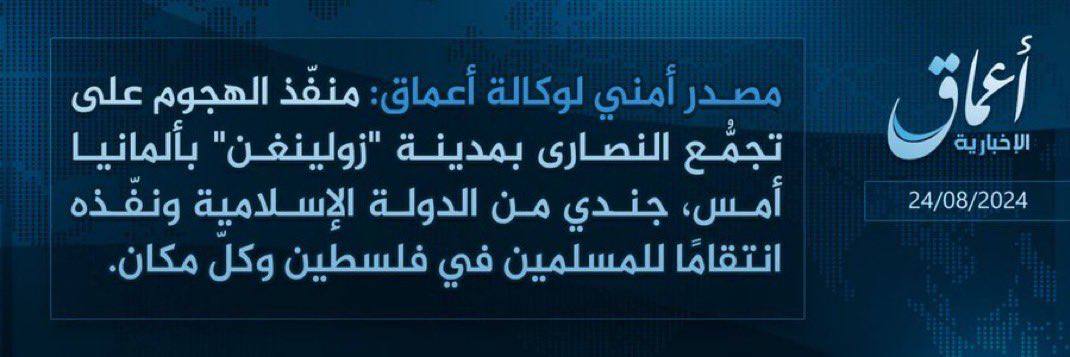 “Almanya’nın Solingen kentindeki Hıristiyan topluluğuna dün düzenlenen saldırının faili İslam Devleti’ne ait bir askerdi ve bunu Filistin’deki ve her yerdeki Müslümanlara karşı intikam almak amacıyla gerçekleştirdi.“