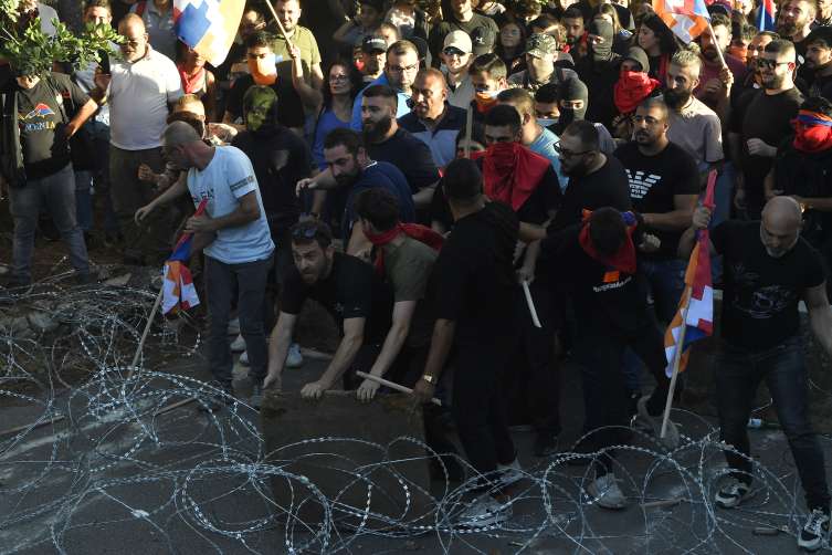 Azerbaycan ile Türkiye aleyhine sloganlar atan göstericiler, Karabağ ile ilgili pankartlar taşıdı. Kalabalıktan bazıları güvenlik güçlerinin kurduğu barikatı aşarak büyükelçilik binasına saldırmaya çalıştı.