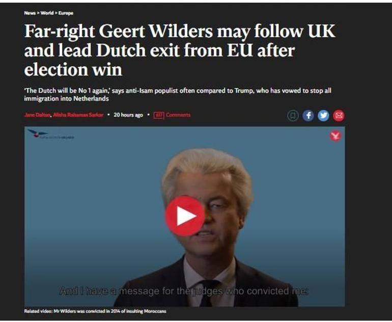 Wilders’ın seçim kampanyasında Hollanda’nın Avrupa Birliği’nden ayrılması için bir referandum yapılmasını talep ettiğini hatırlatan Independent, aşırı sağcı liderin bir televizyon kanalında yaptığı açıklamaları yeniden gündeme taşıdı: