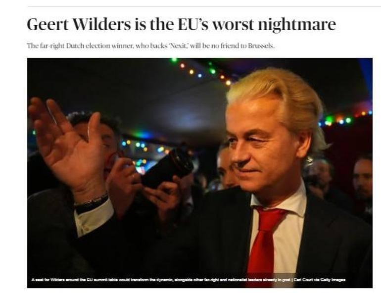 ABD merkezli Politico, “Geert Wilders, AB’nin en kötü kabusu” başlıklı haberinde, Wilders’ın AB’deki diğer aşırı sağ liderlerle yürürlükte olan politikaları tersine çevirebileceğini iddia etti. Politico, Hollanda’nın Avrupa Birliği’nden ayrılmasını isteyen Wilders’ın Brüksel’in dostu olmayacağını öne sürdü.