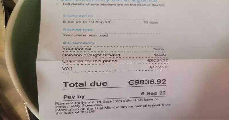 İrlanda’da bir kafe işletmecisi, 9 bin 836 avroluk elektrik faturasını paylaştı. En az 10 kat zam geldiğini ifade eden işletmeci, “Elektrik faturalarının bu kadar zamlanacağını tahmin etmedik, böyle devam ederse iş yapamayız, kepenk kapatırız” dedi.