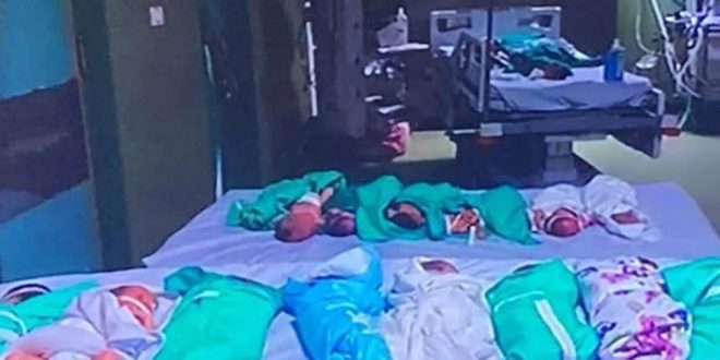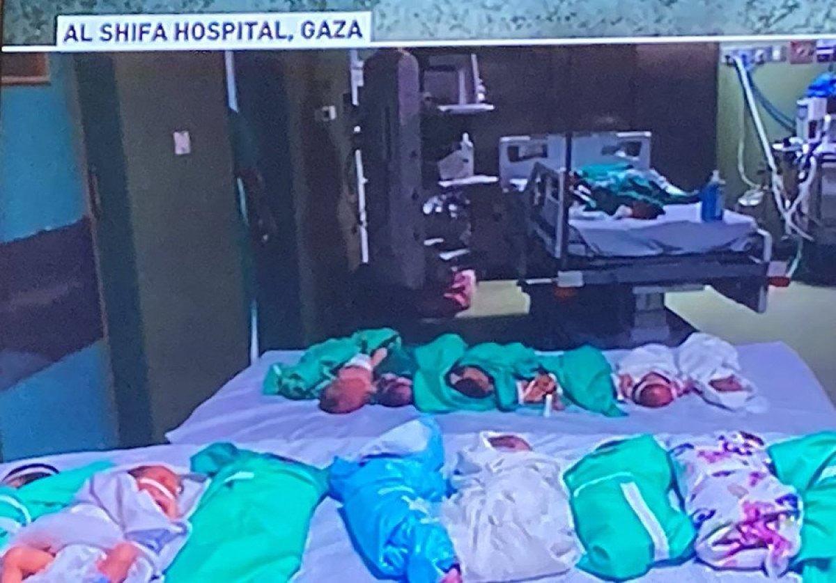 İsrail’in bomba yağdırdığı Şifa Hastanesi’nde erken doğan 37 bebek, hipotermiye yakalanmamaları için, hizmet dışı kalmaları sebebiyle kuvözlerinden çıkarılıp battaniyelere sarıldı.