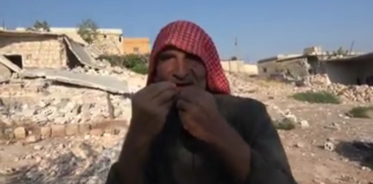 Suriye’de Esad rejiminin attığı bomba ile evleri üzerlerine yıkılan yaşlı adam kameralara karşı, ” Ben ne kumanya istiyorum ne gıda sadece evimde yaşamak istiyorum. Benim evimi yıktıkları gibi Allah da onların evini yıksın. Allah belalarını versin” ifadelerini kullandı.