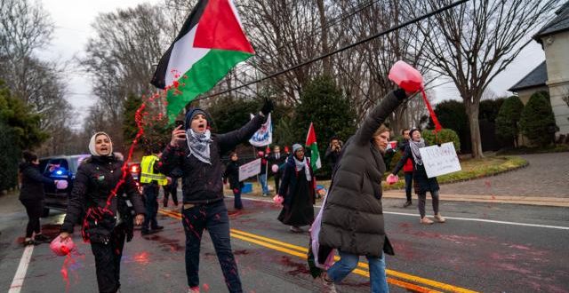 Bir konvoy eşliğinde evinden ayrılan Blinken’a “utanmalısın” diye bağıran protestocular, Filistin bayraklarıyla aracın ardından bir süre koştu. Protestocular, Blinken’ın evinin önüne döktükleri kırmızı boyalarla da kan görüntüsü oluşturdu.