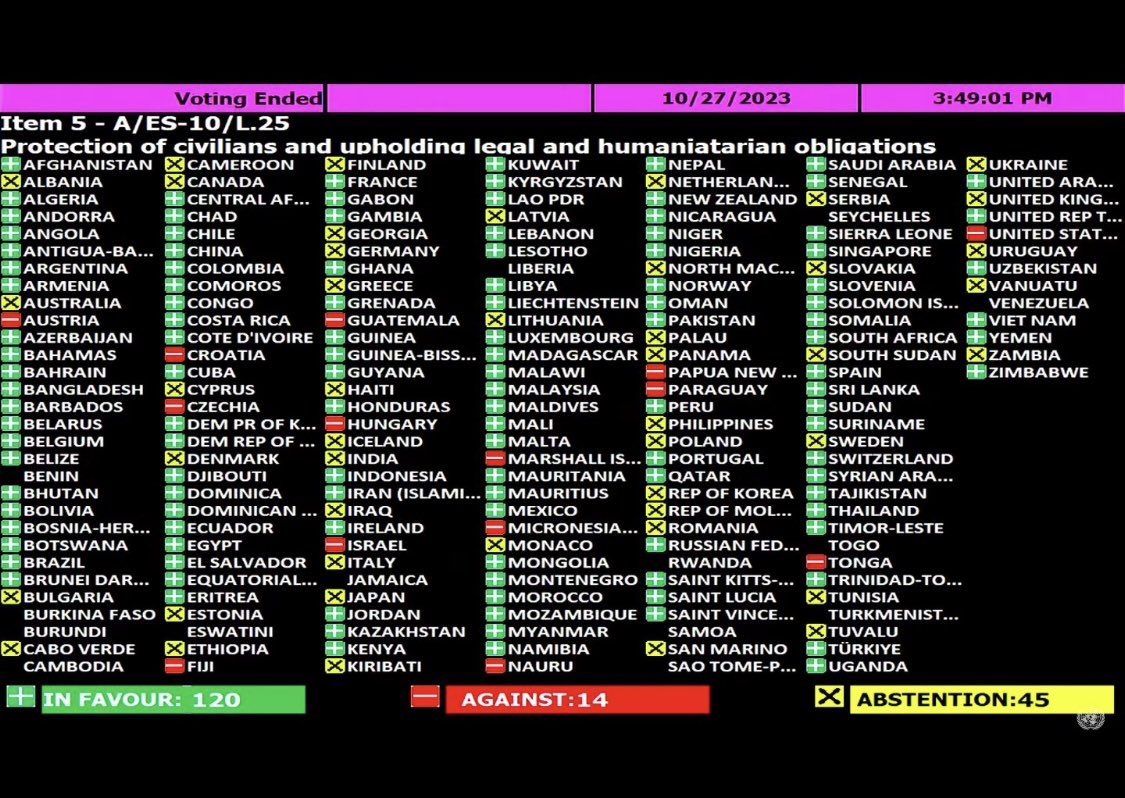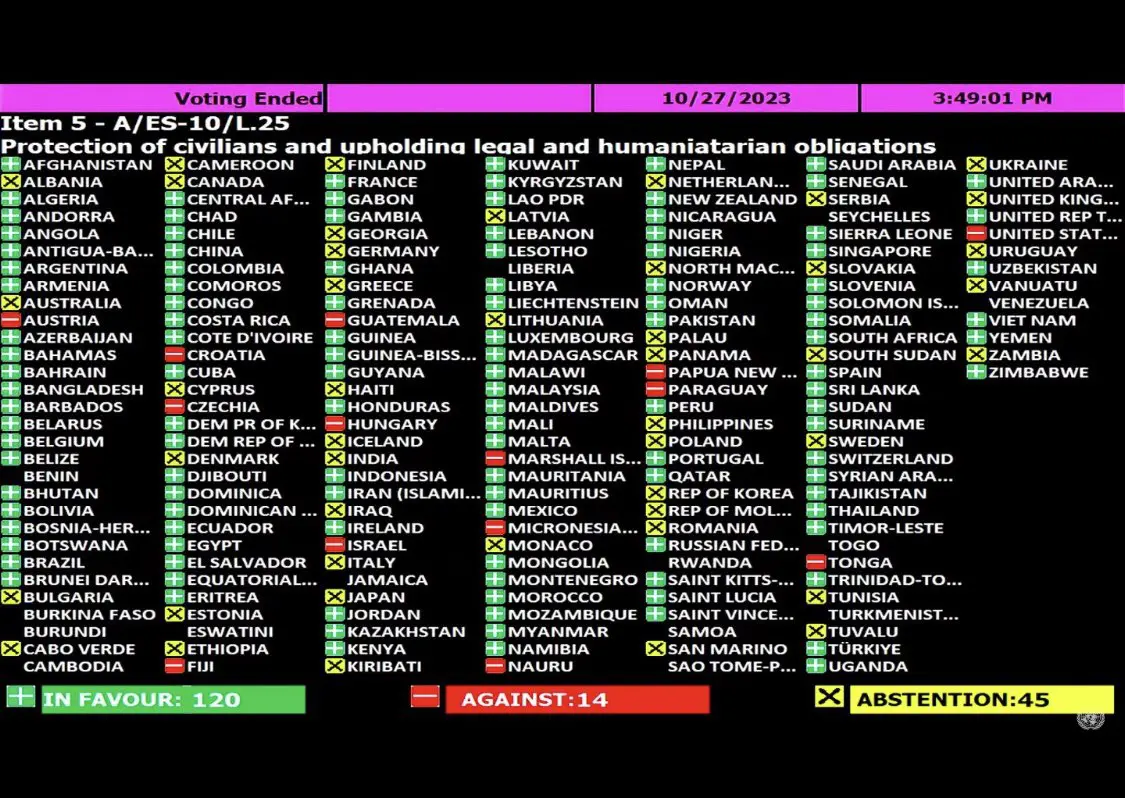 Karar, 120 kabul, 14 red ve 45 çekinser oy ile aldı. ABD, Avusturya, Hırvatistan, Çekya, Fiji, Guatemala, Macaristan, İsrail, Marşal Adl., Mikronezya, Papua Yeni Gine, Paraguay, Tonga ve Nauru red oyu veren ülkeler.