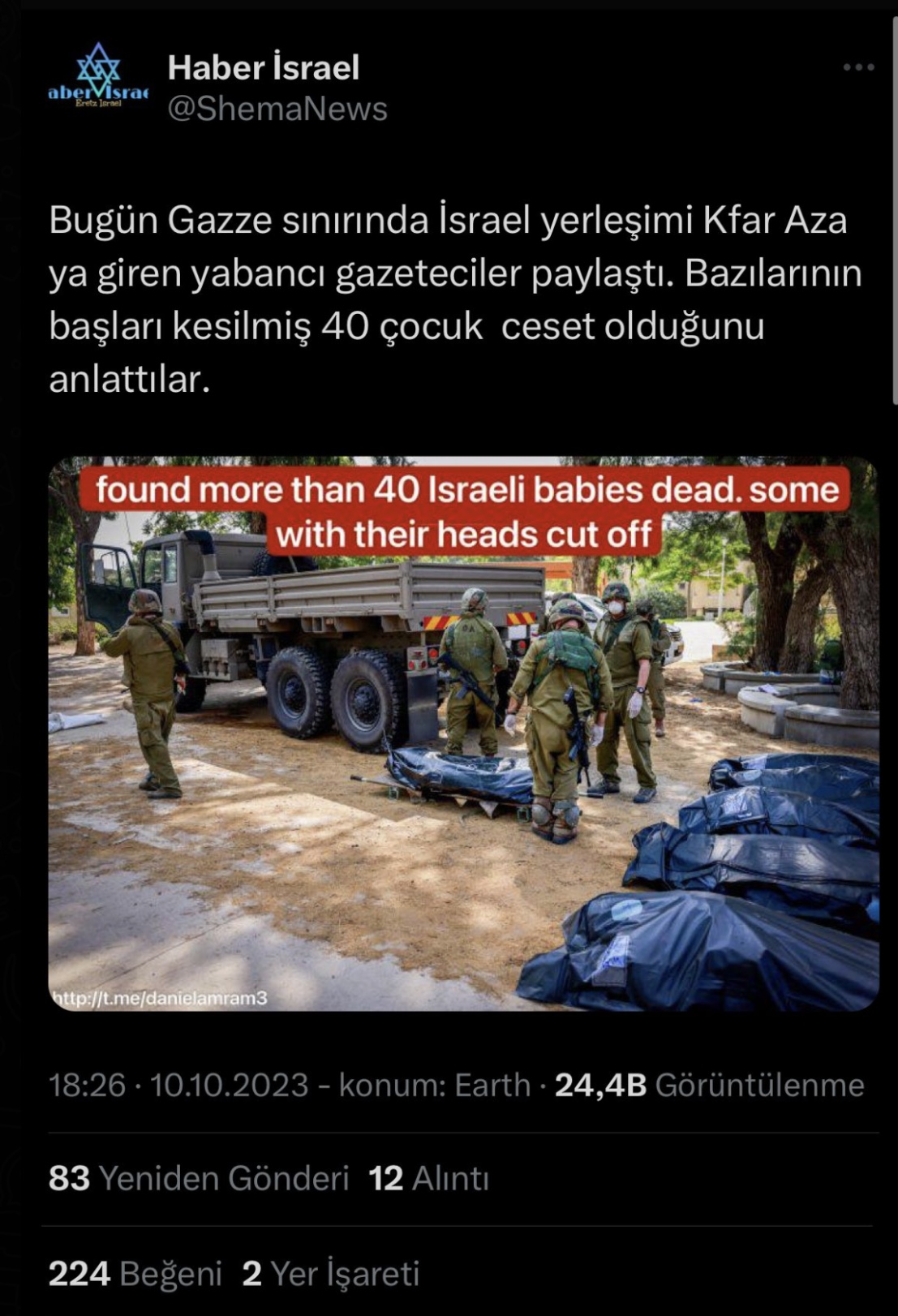 İsrail yanlılarının havada kapıp ortalığı ayağa kaldırdığı ‘Hamas’ın 40 bebeğin başını kestiği’ iddiası, İsrail tarafından “elde teyit edecek bir bilgi bulunmadığı” gerekçesiyle teyit edilmedi. İşgal ordusu, bu bilgiyi haberlerden duyduğunu itiraf etti.