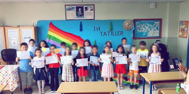 İstanbul Silivri’deki Kavaklı İlkokulu’nda 2-A sınıfında sınıf öğretmenliği yapan A.N. isimli öğretmen, öğrencilerin karne almasının ardından hatıra fotoğrafını sınıfa asılan LGBT bayrağı önünde çektirdi.