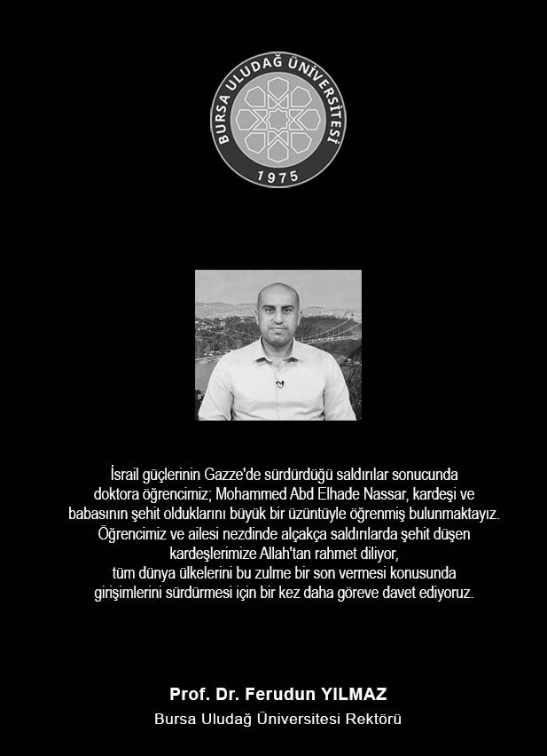 Uludağ Üniversitesi tarafından paylaşılan taziye mesajında, “İsrail güçlerinin Gazze’de sürdürdüğü saldırılar sonucunda doktora öğrencimiz Mohammed Abd Elhade Nassar, kardeşi ve babasının şehit olduklarını büyük bir üzüntüyle öğrenmiş bulunmaktayız. Öğrencimiz ve ailesi nezdinde alçakça saldırılarda şehit düşen kardeşlerimize Allah’tan rahmet diliyor, tüm dünya ülkelerini bu zulme bir son vermesi konusunda girişimlerini sürdürmesi için bir kez daha göreve davet ediyoruz” ifadeleri kullanıldı.