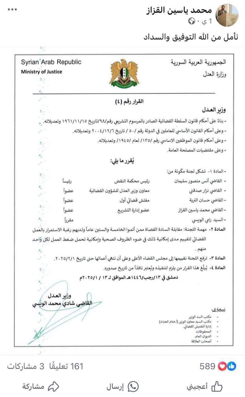 Adalet Bakanlığı son olarak eski rejimin kıdemli hakimlerinden Muhammed Yasin El Kazzaz’ı yasama dairesi başkanlığına atadı ve Kazzaz bu kararı sosyal medya sayfasında gururla paylaştı.