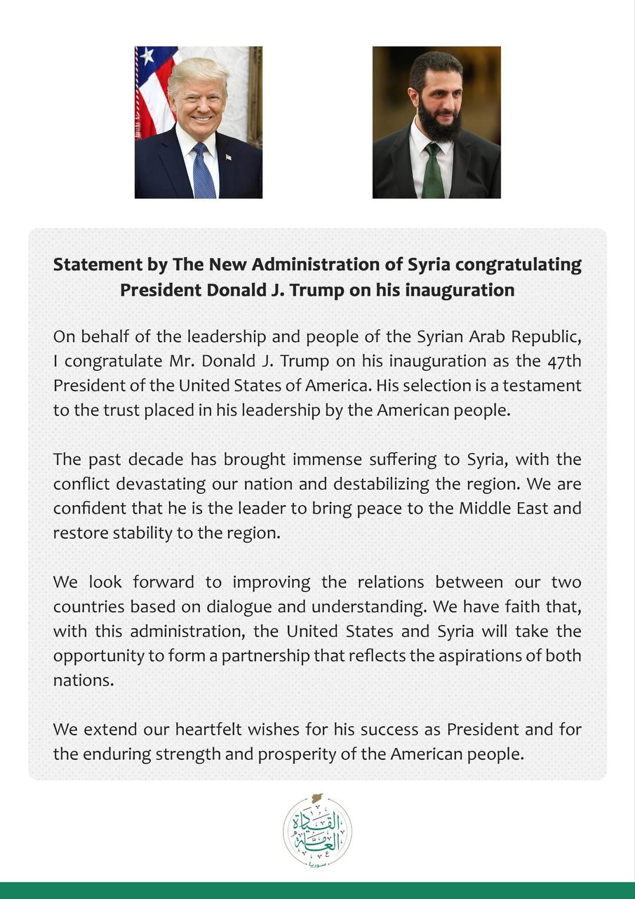 Suriye Arap Cumhuriyeti liderliği ve halkı adına, Donald J. Trump’ı Amerika Birleşik Devletleri’nin 47. Başkanı olarak göreve başlamasından dolayı tebrik ediyorum. Seçilmesi, Amerikan halkının onun liderliğine duyduğu güvenin bir kanıtıdır.