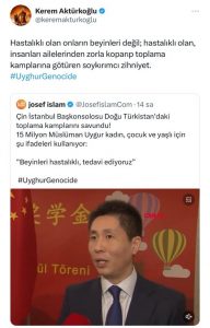 Çin’in İstanbul Başkonsolosu Çin’in Doğu Türkistan’da kurduğu soykırım kamplarını savundu. Başkonsolosu, ‘Radikalizm düşüncesinden etkilenen kişi için. Onların beyinleri hastalıklı. Bu hastalığı iyileştirmek için o okulları kurduk.’ dedi.