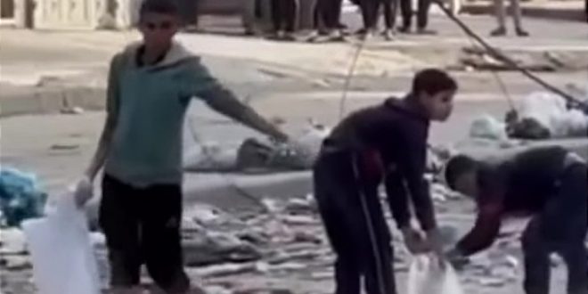 Videodaki çocuklar, un dağıtılan bir alandan dağıtım aracının ayrılmasıyla yere dökülüp toza toprağa karışan unları avuçlarıyla poşetlere dolduruyorlar.