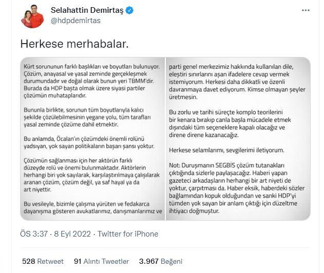 “Demirtaş bugün duruşmada bir saati aşkın süre savunma yaptı. Sorunların silahla, şiddetle çözülemeyeceğini, PKK’nın silahları bırakması gerektiğini, bunun için de Öcalan ile görüşülmesi gerektiğinin doğru olacağını belirtti. Demirtaş’ın savunması haberleştirilirken acele edildiğinden, sözleri bağlamından koparılmıştır. Durum budur ve Demirtaş bu görüşünü istikrarlı bir şekilde defalarca kamuoyuyla paylaşmıştır. Ayrıca, Demirtaş’ın savunmasının SEGBİS tam çözümü, önümüzdeki günlerde kamuoyuyla paylaşılacaktır.”