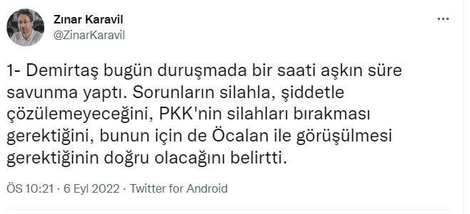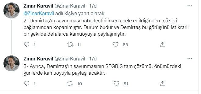 Öte yandan Selahattin Demirtaş’ın Basın Danışmanı Zınar Karavil de, Twitter’dan yaptığı açıklamada, “sözleri haberleştirilirken acele edildiğinden Demirtaş’ın sözlerinin bağlamından koparıldığını” vurguladı. Karavil, şu açıklamayı yaptı: