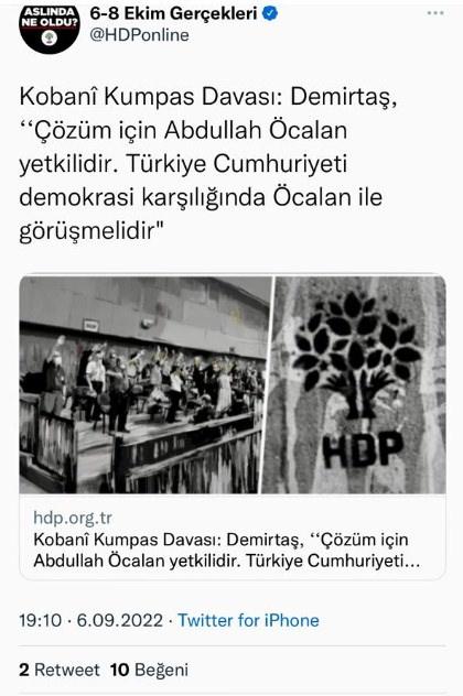 6-8 Ekim olaylarının faili Demirtaş, “Türkiye Cumhuriyeti, Abdullah Öcalan ile görüşmelidir” dedi. HDP’nin sosyal medya hesabından Demirtaş’ın açıklamaları paylaşıldı, sonra kısa sürede silindi. Demirtaş’tan yeni açıklama geldi.