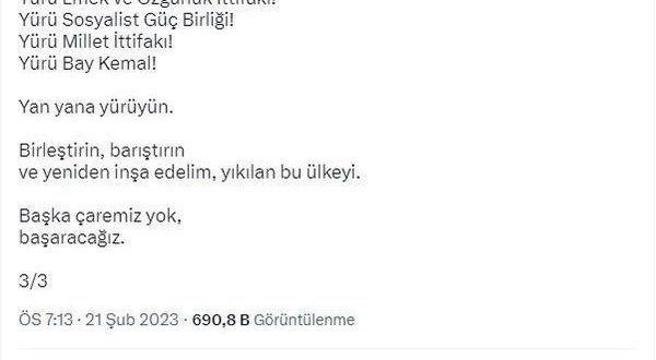 Öte yandan İYİ Parti Genel Başkanı Meral Akşener’in Kılıçdaroğlu’nun adaylığını veto etmesi, 6’lı koalisyonun deprem maskesine sığınarak aday açıklamayı ertelemesiyle eşgüdümlü olarak terör tutuklusu Selahattin Demirtaş, “Yürü Bay Kemal” diyerek CHP liderine destek verdi.