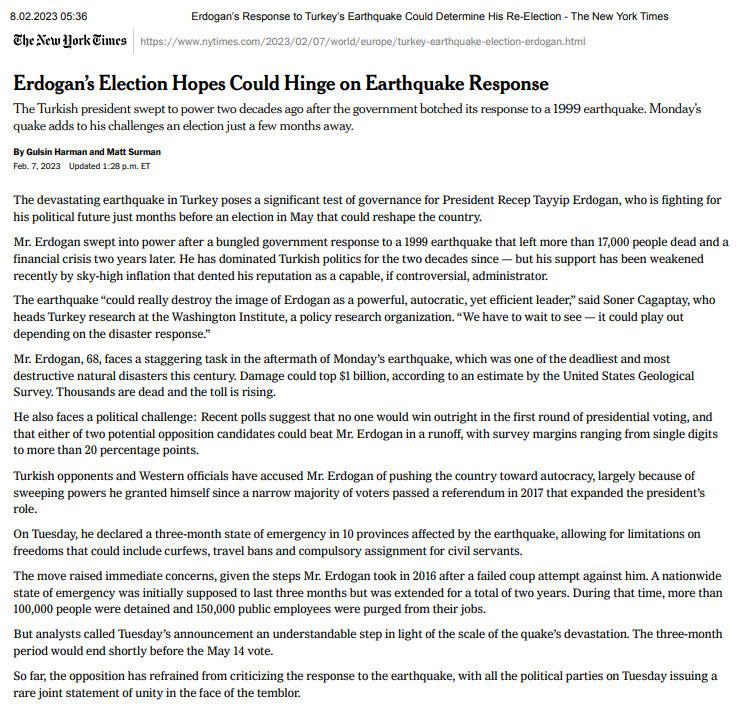 Deprem sonrası seçimleri ele alan bir diğer ABD gazetesi The New York Times oldu. Gazete “Erdoğan’ın seçim umutları deprem sonrasındaki sürece bağlı olabilir” başlıklı haberinde “Türkiye’deki yıkıcı deprem, mayıs ayında yapılacak ve ülkeyi yeniden şekillendirebilecek seçime aylar kala siyasi geleceği için mücadele eden Cumhurbaşkanı Recep Tayyip Erdoğan için önemli bir sınav teşkil ediyor” ifadelerine yer verdi.