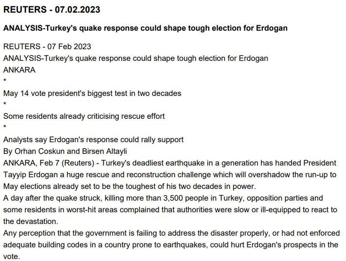 Geçtiğimiz ay Türkiye’de verdiği bir iş ilanında ‘Erdoğan düşmanı gazeteci’ aradığını açık açık şartlarına yazan İngiltere basınından Reuters’ta seçim hesapları yapmaktan kaçınmadı. “Türkiye’nin depreme verdiği tepki Erdoğan için zorlu seçimi şekillendirebilir” başlığıyla yayınladığı haberinde, deprem sonrası 14 Mayıs seçimlerinin Cumhurbaşkanı Erdoğan’ın 20 yıllık iktidarındaki en zor seçim olacağını iddia etti.
