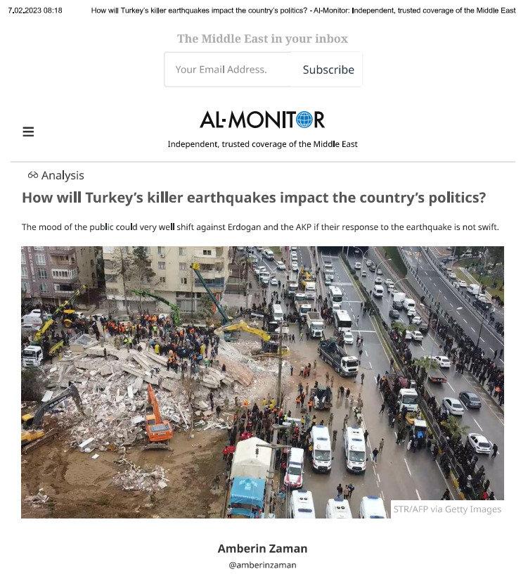 ABD’de yayın yapan Al Monitor gazetesi “Türkiye’nin öldürücü depremleri ülkenin siyasetini nasıl etkileyecek?” başlığıyla yaptığı haberde, 14 Mayıs 2023’te yapılması planlanan seçimlerin ertelenip ertelenmeyeceğinin merak konusu olduğunu yazdı. 17 Ağustos 1999 depreminden sonra Cumhurbaşkanı Erdoğan’ın popülaritesinin arttığı ve siyasi hayatında büyük etkisinin olduğu söylenen haberde, önümüzdeki günlerin Erdoğan için çok önemli olduğu belirtildi. Gazete haberinde “Pazartesi günü yaşanan felaketin boyutu, Erdoğan’ın bile bu kez boyunu aşmış olabileceğini gösteriyor” ifadelerini kullandı.
