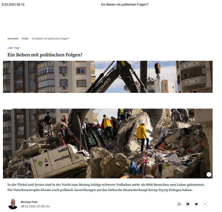 Almanya’da yayın yapan Redaktionsnetzwerk Deutschland isimli gazete de “Siyasi sonuçları olabilecek bir depremle mi karşı karşıyayız?” başlıklı haberinde “Meydana gelen doğal afet, Türkiye Cumhurbaşkanı Recep Tayyip Erdoğan üzerinde siyasi bir etkiye de sahip olabilir.” ifadelerini kullandı. Cumhurbaşkanı Erdoğan’ın 2023’ü bir zafer yılı olarak hesapladığı söylenen haberde, “Ancak şimdi yıldönümü yılı, ülkenin yakın tarihindeki en kötü felaketlerden birinin gölgesinde kalıyor. GerdHöhler, analizinde felaketin Erdoğan için de sonuçları olabileceğinden şüpheleniyor.” dedi.