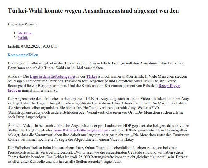 Türkiye’de yaşanan büyük felaketi değil de, 14 Mayıs‘taki seçimleri konu edinen bir diğer medya organı ise Frankfurter Rundschau-İnternet oldu. Almanya’da yayın yapan internet sitesi, “Türkiye seçimleri olanağanüstü hal nedeniyle iptal edilebilir” başlıklı haberinde “Seçimlerin gerçekten yapılıp yapılmayacağını önümüzdeki haftaların göstereceğini söyleyen Türkiye uzmanı, “Erdoğan, 2-3 hafta içinde ülkedeki havanın nasıl olduğunu görecek. Eğer hava kötüyse ve oy oranları düşükse, muhtemelen 14 Mayıs’taki seçimleri iptal edecek.” ifadelerini kullandı.