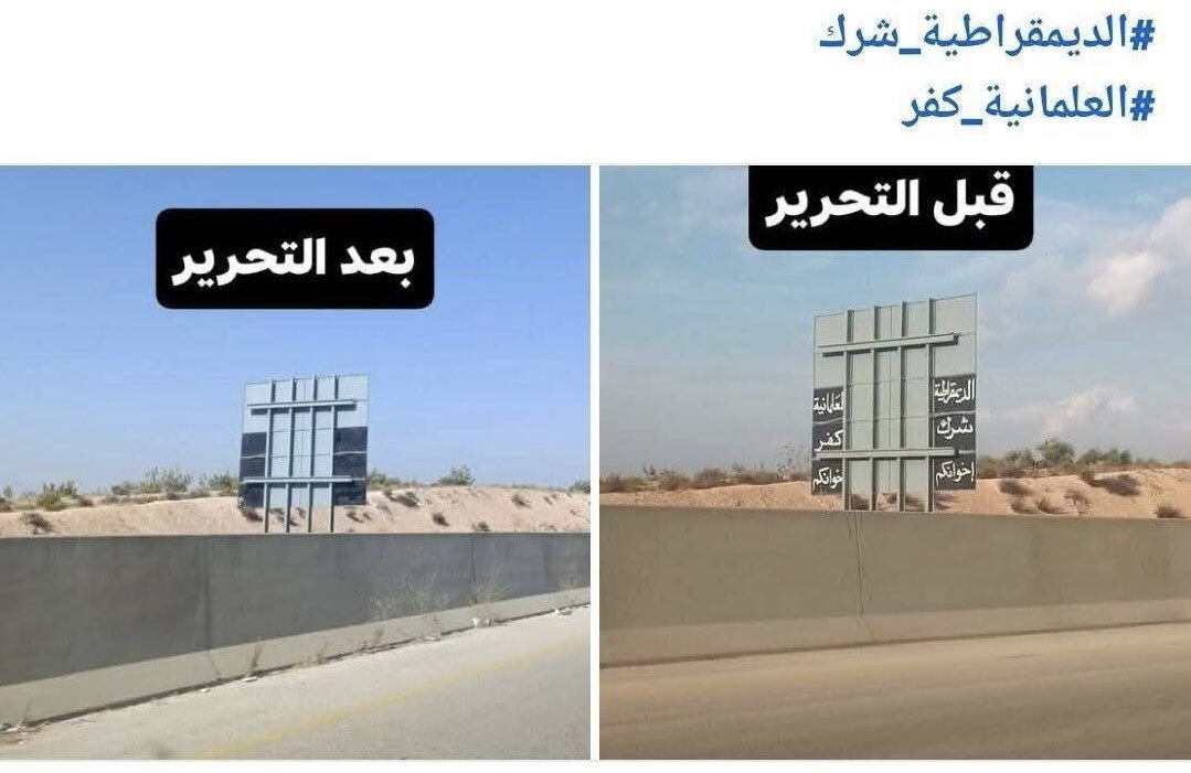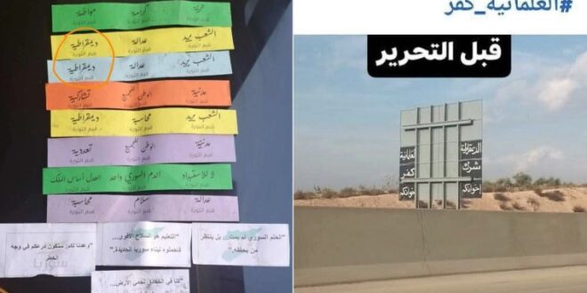Söz konusu tabelalar, İdlib’te HTŞ döneminde yol kenarlarında ve sokaklarda bulunuyordu. Görselde bulunan tabelanın üzerinde ise, demokrasinin şirk ve laikliğin küfür olduğu yazmaktaydı.