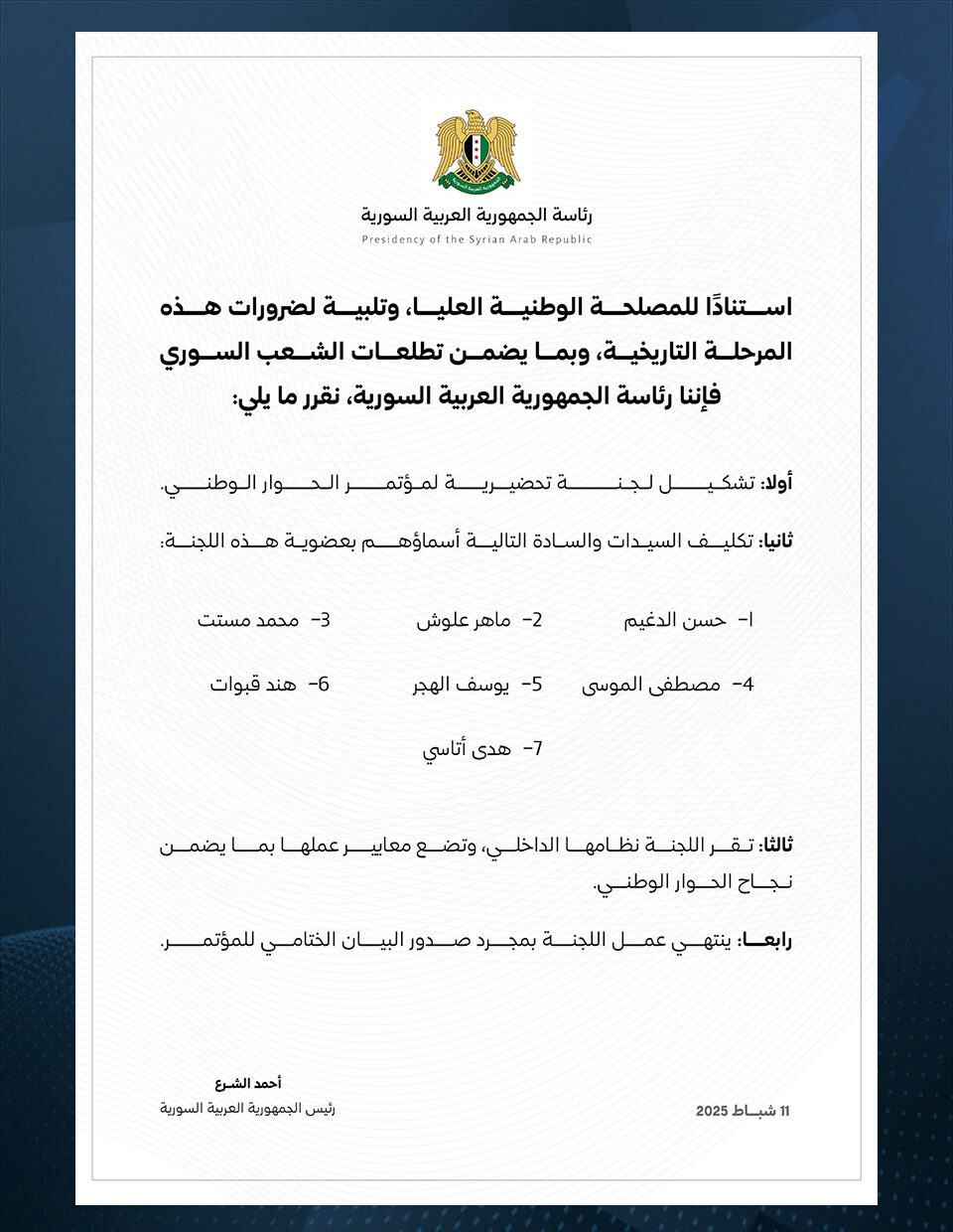 Suriye’deki yeni yönetim, Esed rejiminin ardından gerçekleşecek siyasi geçiş sürecinin önemli ayaklarından biri olan Ulusal Diyalog Konferansı için bir hazırlık komitesi oluşturulduğunu duyurmaya hazırlanıyor.