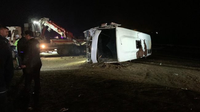 Diyarbakır’ın Silvan ilçesinde polis ve bekçileri taşıyan otobüsün devrilmesi sonucu 11 kişi yaralandı.