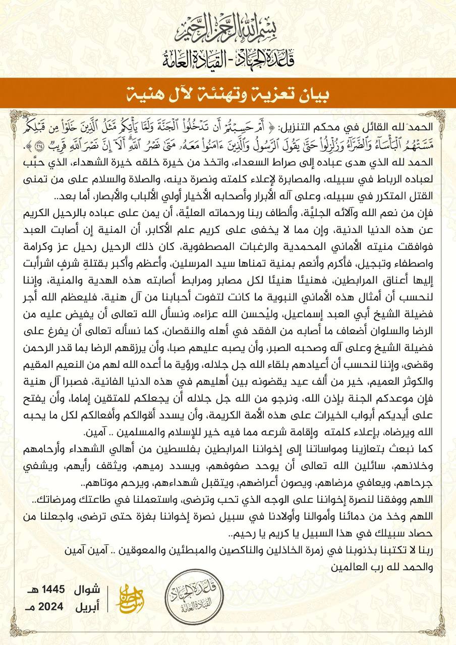 Ayrıca Cenâb-ı Hakk’tan Şeyh Hazretleri’ne, onun ailesine ve ashabına sabır ihsan etmesini, üzerlerine sabır yağdırmasını ve onları Rahman’ın takdirine ve takdir ettiğine razı etmesini diler ve onların bayramlarının Allah’a kavuşarak olacağına inanıyoruz. O’na hamdolsun ve Allah’ın onlar için hazırladığı kalıcı mutluluk ve büyük bolluğun, bu ölümlü dünyada aileleri arasında geçirilen bin bayramdan daha iyi olduğunu görmek, bu yüzden sabırlı ol Haniyeh ailesi, çünkü senin randevun Cennettir, Allah’ım Seni salihlere önder yapmak, bu aziz millete hayır kapılarını senin ellerinle açmak, söz ve eylemlerini Allah’ın sevdiği her şeye hidayet etmesini Allah’tan niyaz ederiz. O’nun sözünü tutmak, İslam ve Müslümanlar için hayırlı olan şeriatını tesis ederek razı olur.. Amin.”