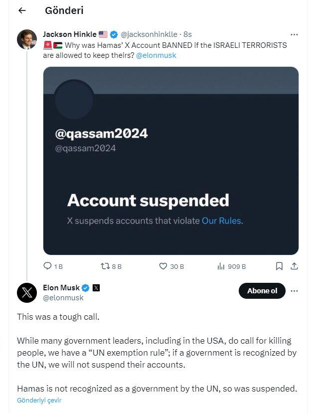 Kassam Tugayları’nın açtığı hesabın X’te askıya alınması kullanıcıların tepkilerine neden oldu. Musk konuyla alakalı “”Hamas, BM tarafından bir hükümet olarak tanınmıyor, bu nedenle askıya alındı” açıklamasını yaptı.