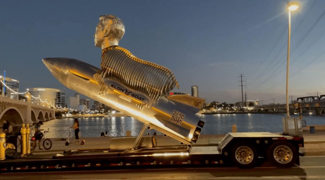 Tesla, SpaceX ve Twitter’ın sahibi Elon Musk’ın hayranları, idolleri için bir keçi gövdesine Musk’ın başını ekleyerek 30 metrelik bir heykel yaptı. 600 bin dolarlık heykelde, multi milyarderin kafası ile hayvanın vücudunun birleşimi bir rokete binerken görülüyor.