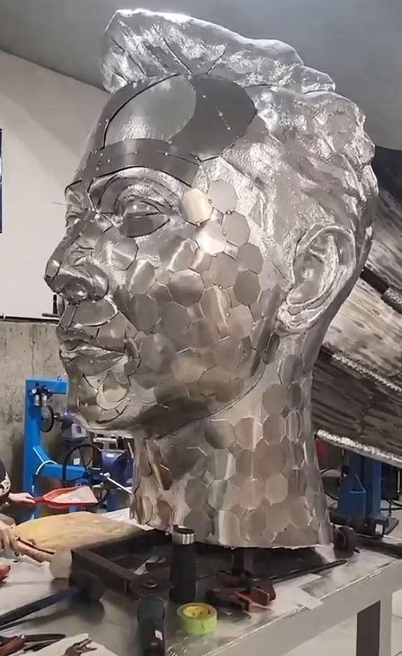 5,9 metre boyundaki heykelin alüminyum başı, Kanadalı metal heykeltıraşlar Kevin ve Michelle Stone tarafından yapıldı.