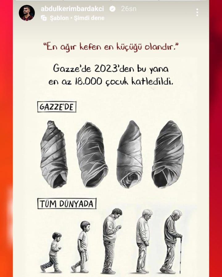 Bardakcı, hikâye bölümünde paylaştığı görselde, “En ağır kefen en küçüğü olandır” sözüyle İsrail terörüne dikkat çekerken, “Gazze’de 2023’ten bu yana en az 18.000 çocuk katledildi” ifadesine yer verdi. Paylaşım, dünyadaki doğal yaşam döngüsünün aksine, Gazze’de çocukların henüz büyümeden toprağa verildiğini gösteren çarpıcı bir illüstrasyonla desteklendi.