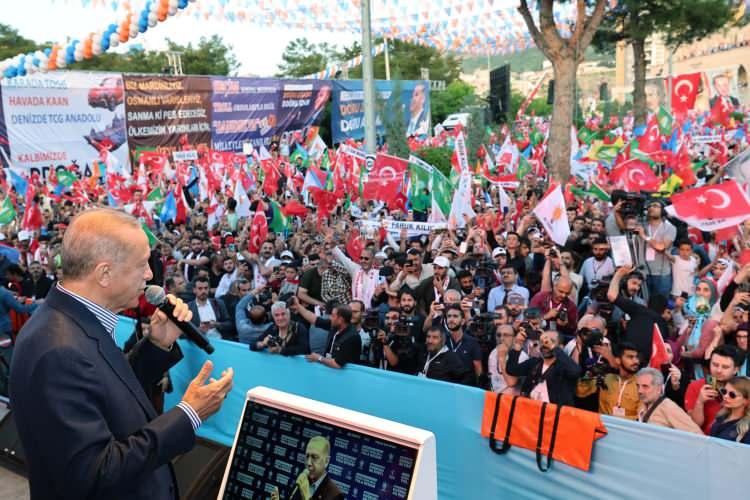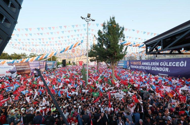 Bunlar sadece yaptıklarımızın kısa bir özeti. Bu eser ve hizmetler yarım kalmaması için sandıklara sıkı sıkıya sahip çıkıyor muyuz? Mardin’den rekor bir oy oranı bekliyoruz. Cumhuriyetimizin ilk asrında milli mücadele verip ülkeyi kurarken, bu bölge üzerinde çok oyunlar oynandı. Bu kadim topraklar üzerinde hesapları olanlar sinsi hedeflerinden hiç vazgeçmedi. Türkiye’yi ekonomik olarak bitik yerlerden biri yapmak için çok uğraştılar. Sizler bu oyunu gördüğünüz için milletimizin birliğinden yana yaptınız. Birileri ilçelerin sokaklarını çukurlarla bölmek için biz kendimizi siper ettik. Nice terbiyesizliklerle uğraştık.