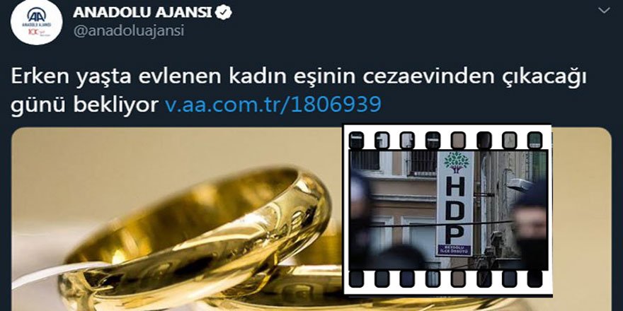 HDP’den yapılan açıklamada, AA’nın 16 Nisan’da “Erken yaşta evlenen kadın eşinin cezaevinden çıkacağı günü bekliyor” başlıklı haberi için suç duyurusunda bulunulduğu belirtildi.