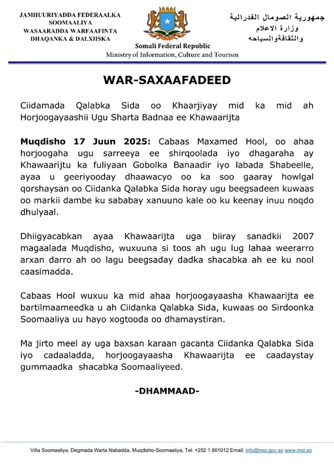 Somali Enformasyon Bakanlığı, güvenlik güçerinin söz konusu silahlı örgütlere yönelik operasyonlarının devam edeceğini bildirdi.