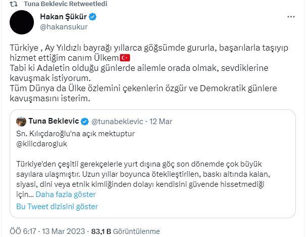 Firari FETÖ’cü Tuna Bekleviç de CHP Genel Başkanı Kemal Kılıçdaroğlu’nun 6’lı koalisyonun cumhurbaşkanı adayı olması sonrasında Kılıçdaroğlu’na hitaben açık bir mektubu sosyal medya hesabından paylaştı. Kılıçdaroğlu’na Türkiye’ye dönmek için hazır oldukları çağrısında bulunan Bekleviç’e destek ise FETÖ’cü Ahmet Kalkan, Emre Uslu ve Hakan Şükür’den geldi.