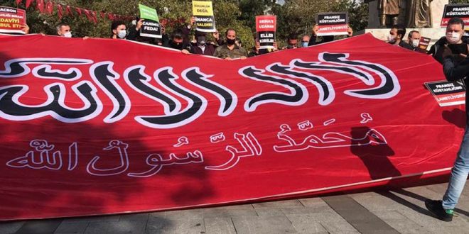 Eylemde “Resullah’a (s) Yönelik Fransız Küstahlığını Lanetliyoruz!”, “Resullah’a (s) ve İslami Değerlere Hakaret İfade Özgürlüğü Değil, İslam Düşmanlığıdır!” yazılı pankartlar ve “Özgürlük Değil İnanca Saldırı!”, “Macron Küstahlığı Bırak! Tedaviyi Kabul Et!”, “Fransız Küstahlığını Lanetliyoruz!”, “Resul’ün Yoluna Canımız Feda!”, “Emperyalist Fransa Kışkırtmaya Son Ver!” ve “Resul’e Uzanan Eller Kırılır!” yazılı dövizler taşındı.