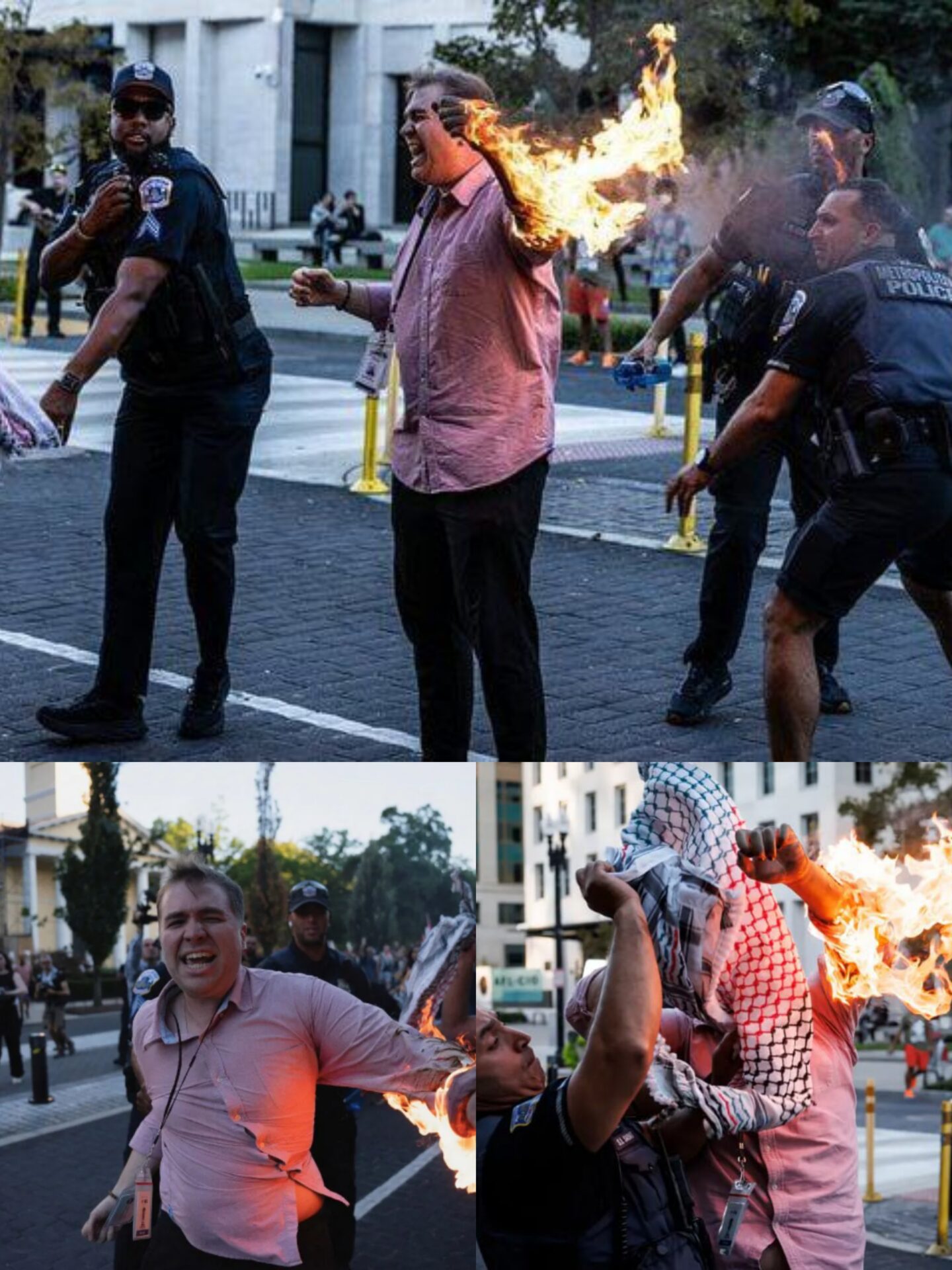 İsrail’in Gazze’deki soykırımının protesto edildiği Washington’da, Beyaz Saray yakınlarında “Ben gazeteciyim. Lütfen yalan haberi durdurun,” diyen bir muhabir kendini ateşe vermeye teşebbüs etti.