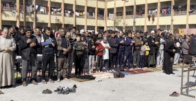 Gazze’deki Filistinliler, İsrail saldırılarında kentteki camilerin yıkılması nedeniyle cuma namazını sığındıkları Birleşmiş Milletler Filistinli Mültecilere Yardım Ajansı’na (UNRWA) bağlı Faluca okulunda kıldı.