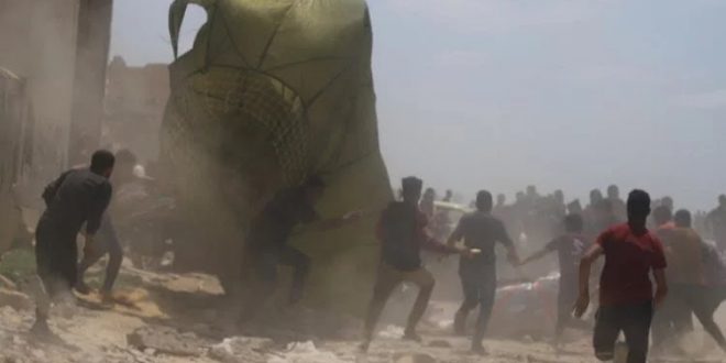 İsrail terör devletinin saldırıları eşliğinde havadan paraşütle gıda yardımlarının bırakıldığı Gazze’nin kuzeyinde, yardımların tutunduğu paraşütlerin açılmaması faciaya yol açtı. Şiddetli açlığın hüküm sürdüğü bölgede erzak kolisi bekleyen Filistinlilerin üzerine onlarca ağırlığında düşen yüzlerce kiloluk paketler, masum siviller hayatına mal oldu.
