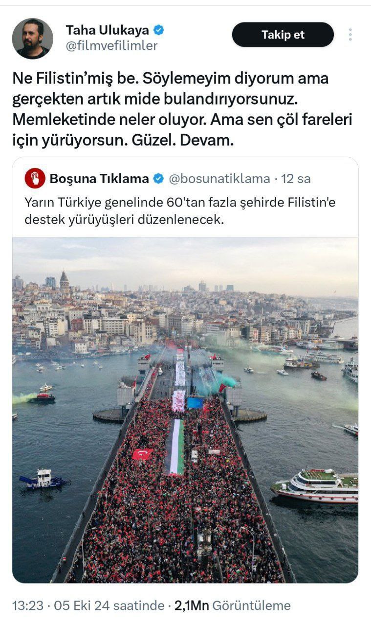 Bugün pek çok ilde düzenlenen Filistin’e destek yürüyüşünü hazmedemeyen tiyatrocu Taha Ulukaya Taksim meydanında Gazze halkı için toplanan insanlara sosyal medya hesabından ateş püskürdü.