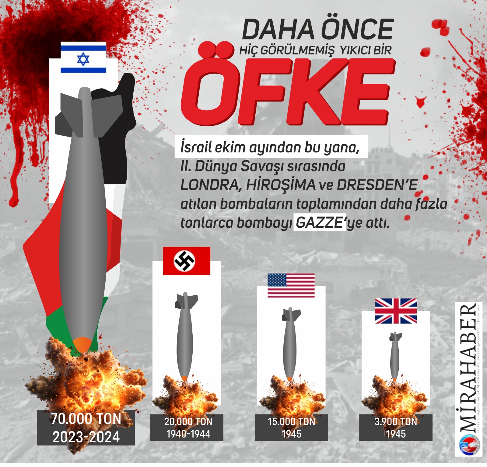 İkinci Dünya Savaşı’nın altı yılı boyunca Hiroşima, Londra ve Dresden gibi şehirlerde kullanılan bombaların toplamından daha fazlası, sadece on ay içinde Gazze’ye yağdırıldı. Bu, savaşın şiddeti ve insanlık dramının derinliği konusunda tüyler ürpertici bir gerçeği gözler önüne seriyor.