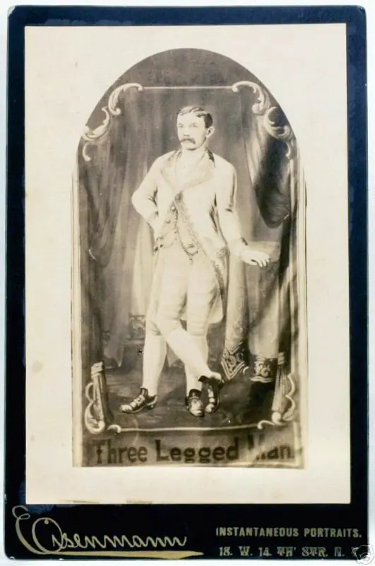 The three-legged man worked as a curiosity. for nearly fifty years, many of them spent with PT. Barnum. He was said to speak five languages and was known to be quite personable.