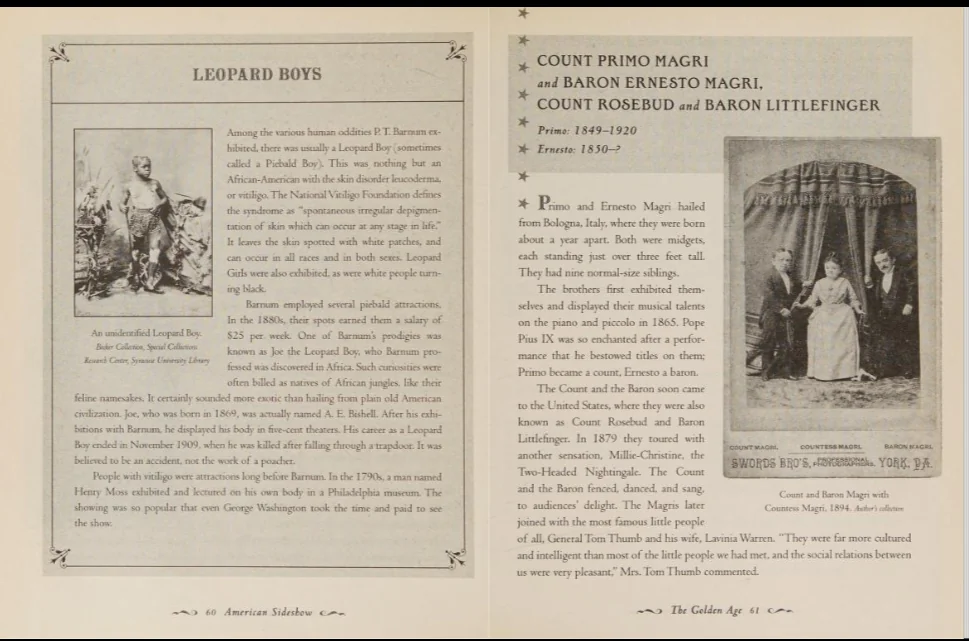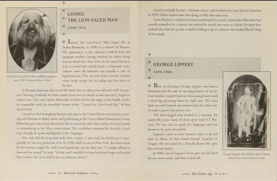 Aşağıda örnek olarak kitaptan verdiğimiz 58-59-60-61 sayfalarda da görüldüğü gibi birer sayfa halinde biyografilere yer verilmiş örneğin sirkte çalışan Lionel- aslan suratlı adam, George Lippert üç bacaklı, leopar çocuklar gibi sirklerde gösteri yapan ucubeleri başlıklar halinde ele almıştır.